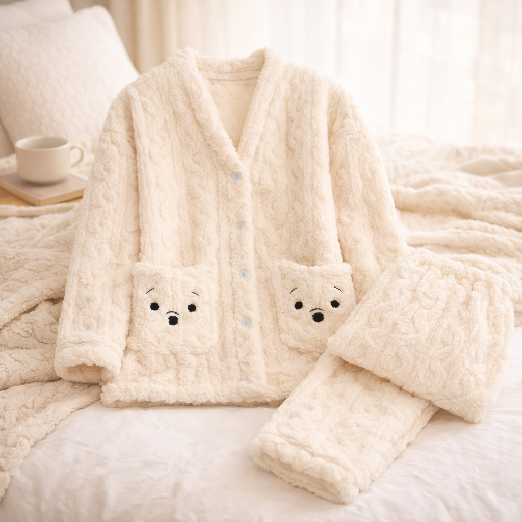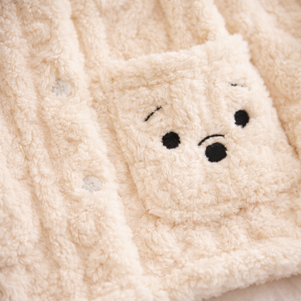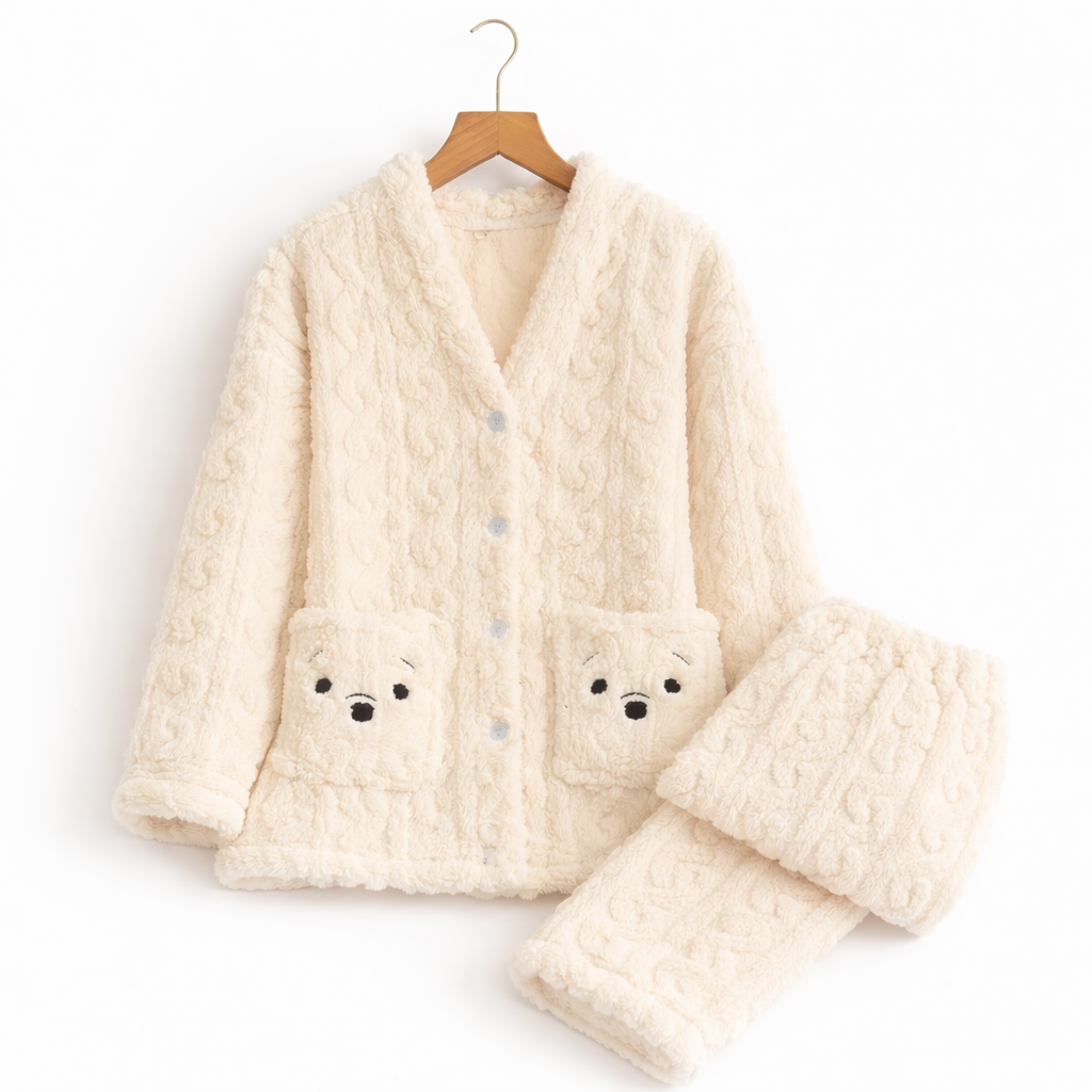 Ce modèle est de couleur crème, une teinte très à la mode dans le monde du homewear. Le haut de cet ensemble possède une fermeture à boutons à l'avant ainsi que deux poches avec un motif amusant brodé. Le bas de ce pyjama est assorti au haut pour un rendu classique et élégant.