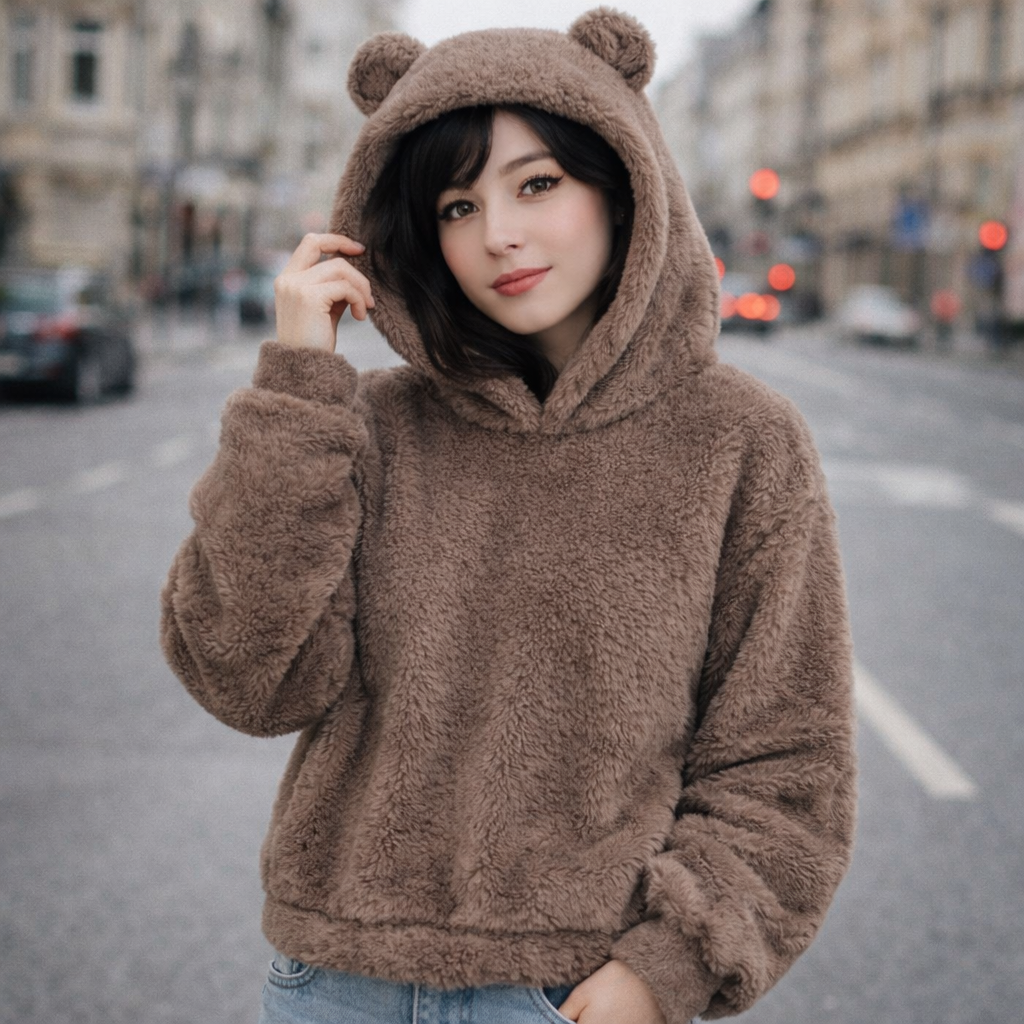 Grâce à sa capuche ornée d’oreilles de lapin, ce pull combine chaleur, douceur et design unique pour un look cosy et irrésistible au quotidien.